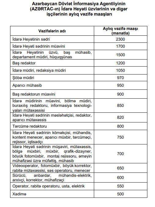 Qərarla “Azərbaycan Dövlət İnformasiya Agentliyinin (AZƏRTAC-ın) İdarə Heyəti üzvlərinin və digər işçilərinin aylıq vəzifə maaşlarının sxemi” aşağıdakı redaksiyada verilib: