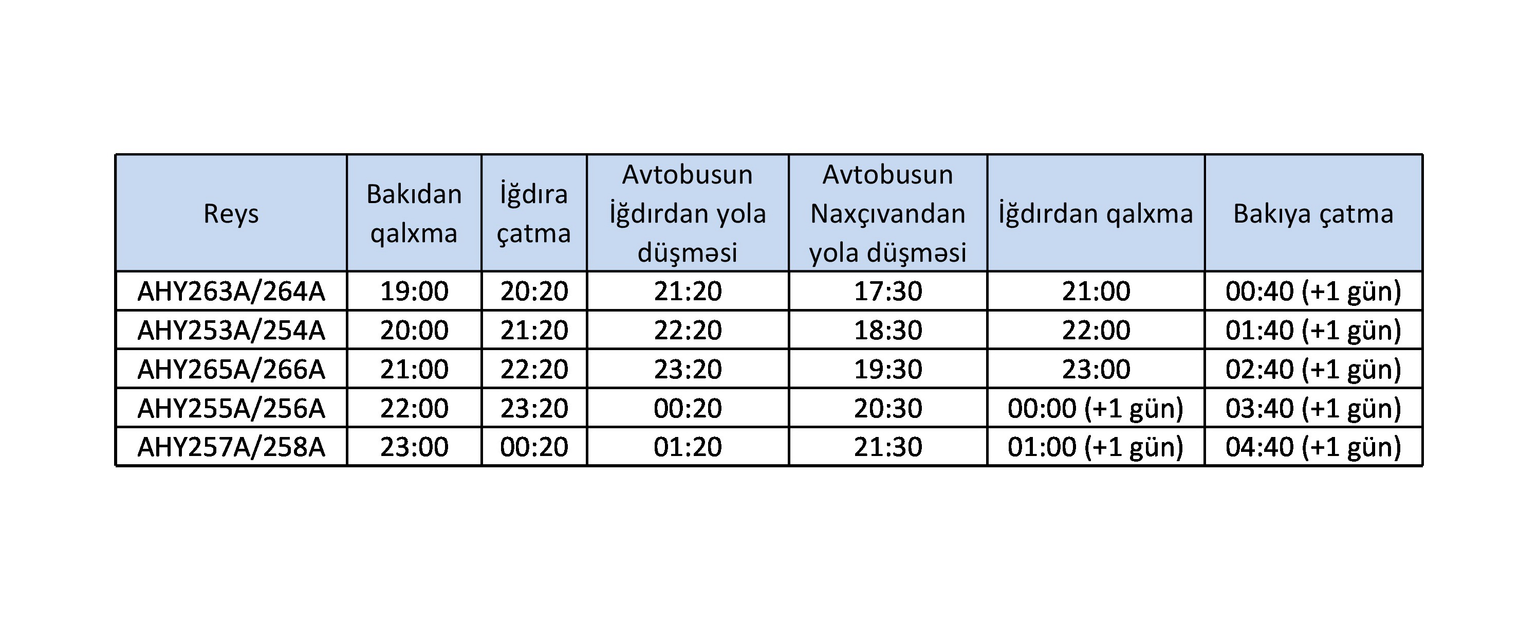“Sərnişinlərin İğdır aeroportundan Naxçıvana və əks istiqamətə daşınması üçün xüsusi avtobuslar təşkil olunub. Avtobus reysləri Naxçıvan avtovağzalı vasitəsilə həyata keçiriləcək”, - deyə AZAL-ın məlumatında qeyd olunur.